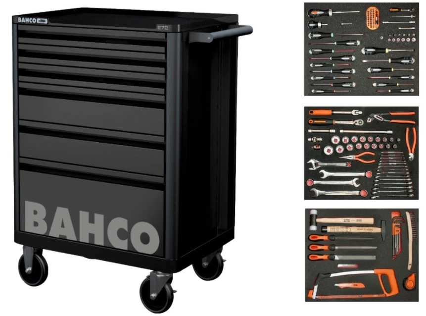 Chariot à outils rempli de Bahco. Le chariot d’outils est équipé de 130 outils.