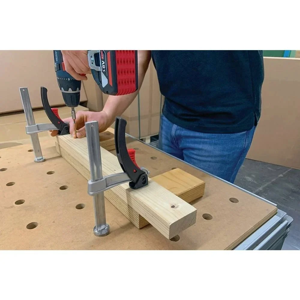 - Pour l’utilisation sur des tables multifonctions comme par ex. Festool MFT et Sortimo WorkMo avec diamètre de perçage 20 mm et épaisseur de plateau entre 19 mm min et 25 mm max.