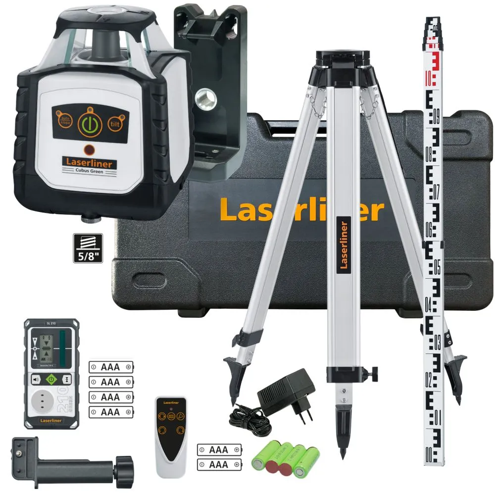 Laserliner Cubus G 210 S set laser rotatif vert, support d’éclairage 150 cm, tige de mise à niveau télescopique 4 m et récepteur laser