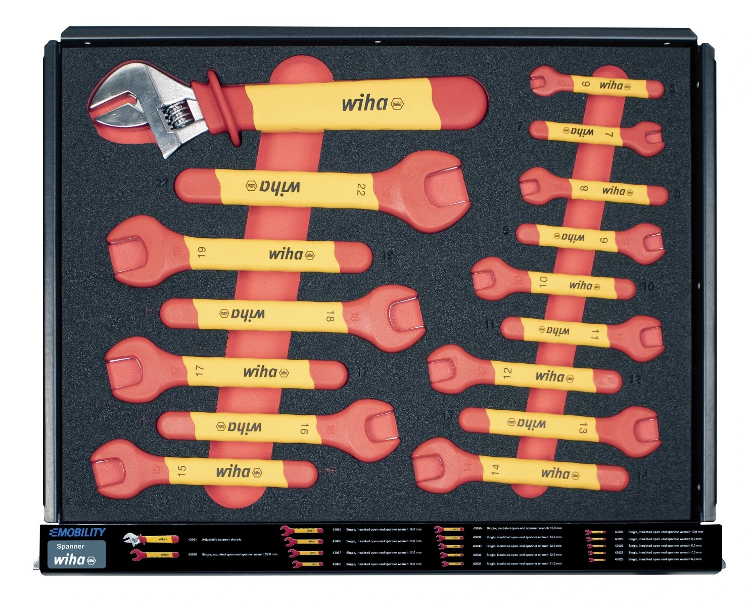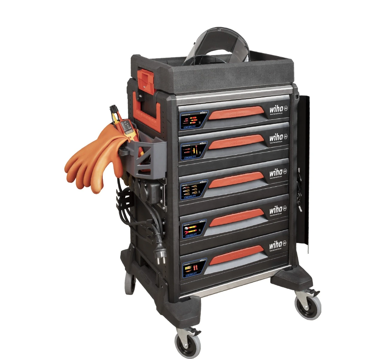- Du testeur de tension à la clé dynamométrique, des gants de protection au panneau d’avertissement : avec le chariot d’atelier entièrement équipé, vous avez toujours le bon outil Wiha à portée de main.